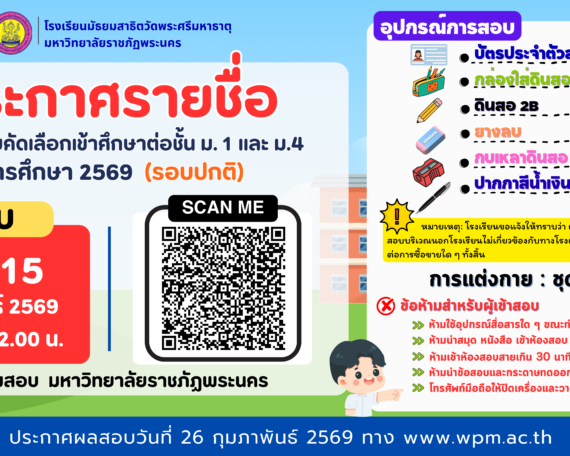 ประกาศรายชื่อผู้มีสิทธิ์สอบเข้าเรียนระดับชั้น ม.1 และ ม.4 ปีการศึกษา 2569