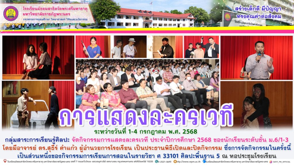 ระหว่างวันที่ 1-4 กรกฎาคม พ.ศ. 2568 กลุ่มสาระการเรียนรู้ศิลปะ จัดกิจกรรมการแสดงละครเวที ประจำปีการศึกษา 2568 ของนักเรียนระดับชั้น ม.6/1-3โดยมีอาจารย์ ดร.สุธีร์ คำแก้ว ผู้อำนวยการโรงเรียน เป็นประธานพิธีเปิดและปิดกิจกรรม ซึ่งการจัดกิจกรรมในครั้งนี้เป็นส่วนหนึ่งของกิจกรรมการเรียนการสอนในรายวิชา ศ 33101 ศิลปะพื้นฐาน 5 ณ หอประชุมโรงเรียน