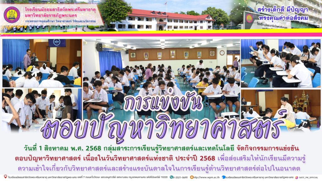 วันที่ 1 สิงหาคม พ.ศ. 2568 กลุ่มสาระการเรียนรู้วิทยาศาสตร์และเทคโนโลยี จัดกิจกรรมการแข่งขันตอบปัญหาวิทยาศาสตร์ เนื่องในวันวิทยาศาสตร์แห่งชาติ ประจำปี 2568 เพื่อส่งเสริมให้นักเรียนมีความรู้ความเข้าใจเกี่ยวกับวิทยาศาสตร์และสร้างแรงบันดาลใจในการเรียนรู้ด้านวิทยาศาสตร์ต่อไปในอนาคต