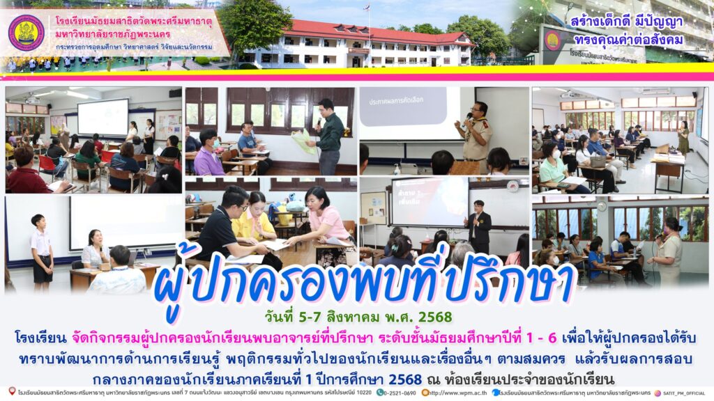 วันที่ 5-7 สิงหาคม พ.ศ. 2568 โรงเรียน จัดกิจกรรมผู้ปกครองนักเรียนพบอาจารย์ที่ปรึกษา ระดับชั้นมัธยมศึกษาปีที่ 1 – 6 เพื่อให้ผู้ปกครองได้รับทราบพัฒนาการด้านการเรียนรู้ พฤติกรรมทั่วไปของนักเรียนและเรื่องอื่นๆ ตามสมควร แล้วรับผลการสอบกลางภาคของนักเรียนภาคเรียนที่ 1 ปีการศึกษา 2568 ณ ห้องเรียนประจำของนักเรียน