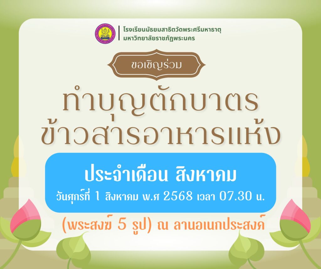 ขอเชิญร่วมกิจกรรม “ทำบุญตักบาตรข้าวสารอาหารแห้ง” ประจำเดือนสิงหาคม พ.ศ. 2568