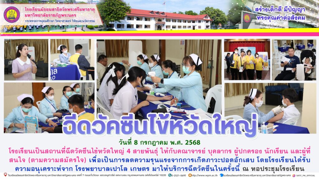 วันที่ 8 กรกฎาคม พ.ศ. 2568โรงเรียนเป็นสถานที่ฉีดวัคซีนไข้หวัดใหญ่ 4 สายพันธ์ุ ให้กับคณาจารย์ บุคลากร ผู้ปกครอง นักเรียน และผู้ที่สนใจ (ตามความสมัครใจ) เพื่อเป็นการลดความรุนแรงจากการเกิดภาวะปอดอักเสบ โดยโรงเรียนได้รับความอนุเคราะห์จาก โรงพยาบาลเปาโล เกษตร มาให้บริการฉีดวัคซีนในครั้งนี้ ณ หอประชุมโรงเรียน