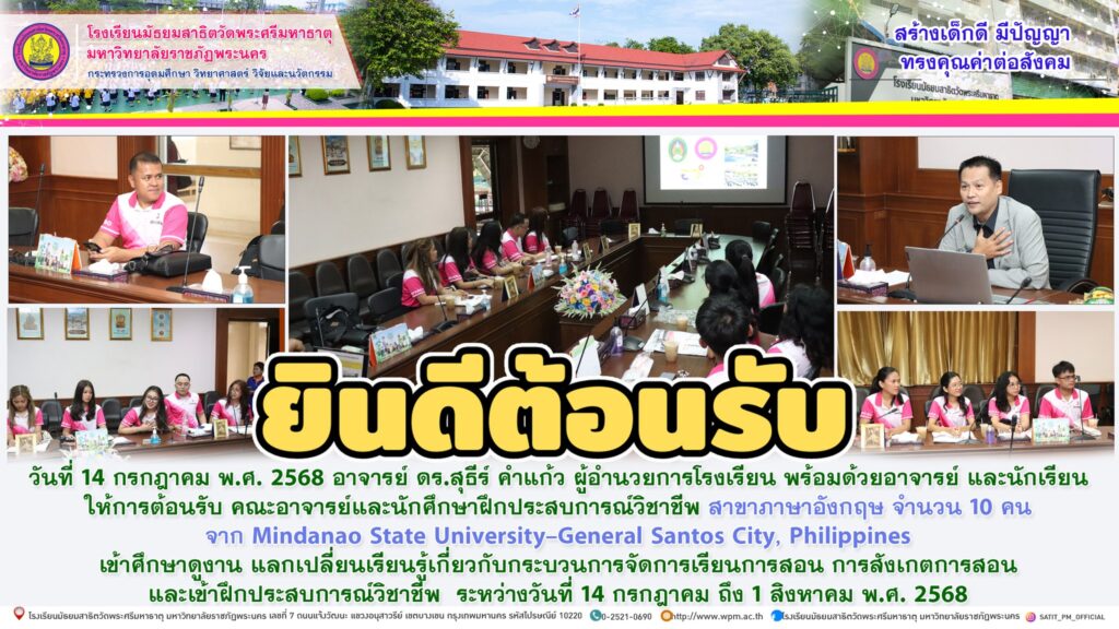 วันที่ 14 กรกฎาคม พ.ศ. 2568 อาจารย์ ดร.สุธีร์ คำแก้ว ผู้อำนวยการโรงเรียน พร้อมด้วยอาจารย์ และนักเรียน ให้การต้อนรับ คณะอาจารย์และนักศึกษาฝึกประสบการณ์วิชาชีพ สาขาภาษาอังกฤษ จำนวน 10 คนจาก Mindanao State University–General Santos City, Philippines เข้าศึกษาดูงาน แลกเปลี่ยนเรียนรู้เกี่ยวกับกระบวนการจัดการเรียนการสอน การสังเกตการสอน และเข้าฝึกประสบการณ์วิชาชีพ ระหว่างวันที่ 14 กรกฎาคม ถึง 1 สิงหาคม พ.ศ. 2568