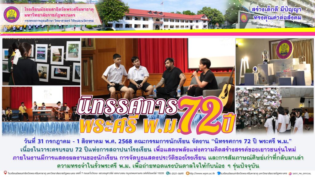 วันที่ 31 กรกฎาคม – 1 สิงหาคม พ.ศ. 2568 คณะกรรมการนักเรียน จัดงาน “นิทรรศการ 72 ปี พระศรี พ.ม.” เนื่องในวาระครบรอบ 72 ปีแห่งการสถาปนาโรงเรียน เพื่อแสดงพลังแห่งความคิดสร้างสรรค์ของเยาวชนรุ่นใหม่ภายในงานมีการแสดงผลงานของนักเรียน การจัดบูธแสดงประวัติของโรงเรียน และการสัมภาษณ์ศิษย์เก่าที่กลับมาเล่าความทรงจำในรั้วพระศรี พ.ม. เพื่อถ่ายทอดแรงบันดาลใจให้กับน้อง ๆ รุ่นปัจจุบัน