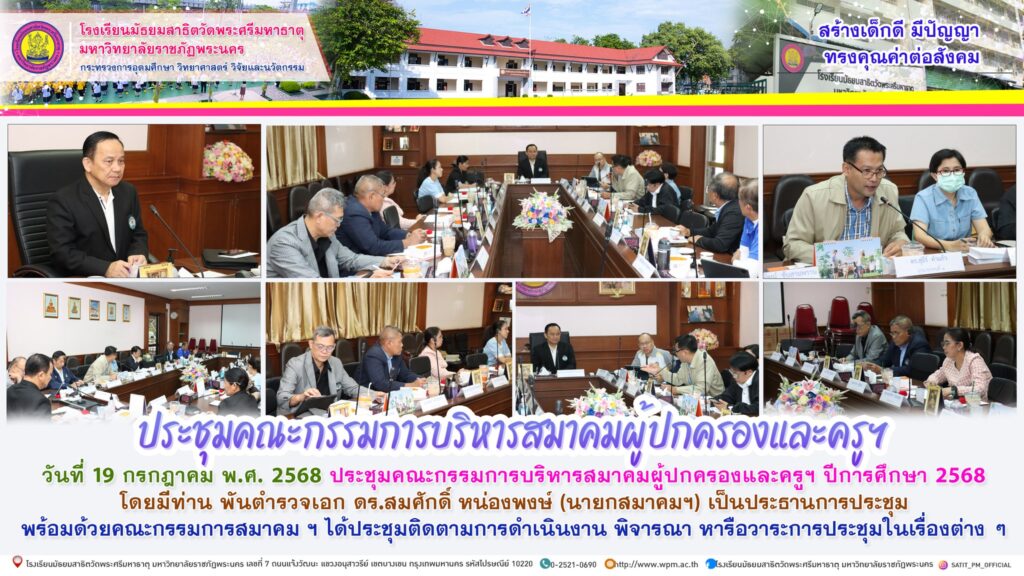 วันที่ 19 กรกฎาคม พ.ศ. 2568 ประชุมคณะกรรมการบริหารสมาคมผู้ปกครองและครูฯ ปีการศึกษา 2568 โดยมีท่าน พันตำรวจเอก ดร.สมศักดิ์ หน่องพงษ์ (นายกสมาคมฯ) เป็นประธานการประชุม พร้อมด้วยคณะกรรมการสมาคม ฯ ได้ประชุมติดตามการดำเนินงาน พิจารณา หารือวาระการประชุมในเรื่องต่าง ๆ