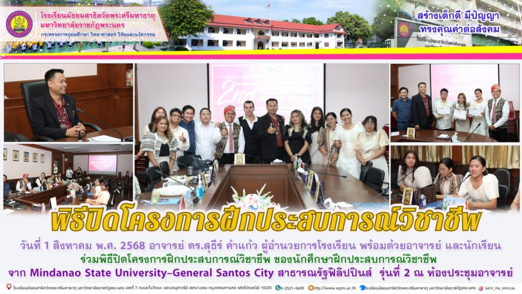 วันที่ 1 สิงหาคม พ.ศ. 2568 อาจารย์ ดร.สุธีร์ คำแก้ว ผู้อำนวยการโรงเรียน พร้อมด้วยอาจารย์ และนักเรียน ร่วมพิธีปิดโครงการฝึกประสบการณ์วิชาชีพ ของนักศึกษาฝึกประสบการณ์วิชาชีพ จาก Mindanao State University–General Santos City สาธารณรัฐฟิลิปปินส์ รุ่นที่ 2 ณ ห้องประชุมอาจารย์