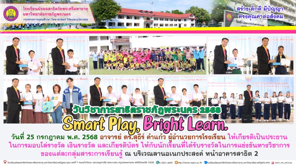 วันที่ 25 กรกฎาคม พ.ศ. 2568 อาจารย์ ดร.สุธีร์ คำแก้ว ผู้อำนวยการโรงเรียน ให้เกียรติเป็นประธานในการมอบโล่รางวัล เงินรางวัล และเกียรติบัตร ให้กับนักเรียนที่ได้รับรางวัลในการแข่งขันทางวิชาการของแต่ละกลุ่มสาระการเรียนรู้ ณ บริเวณลานอเนกประสงค์ หน้าอาคารสาธิต 2