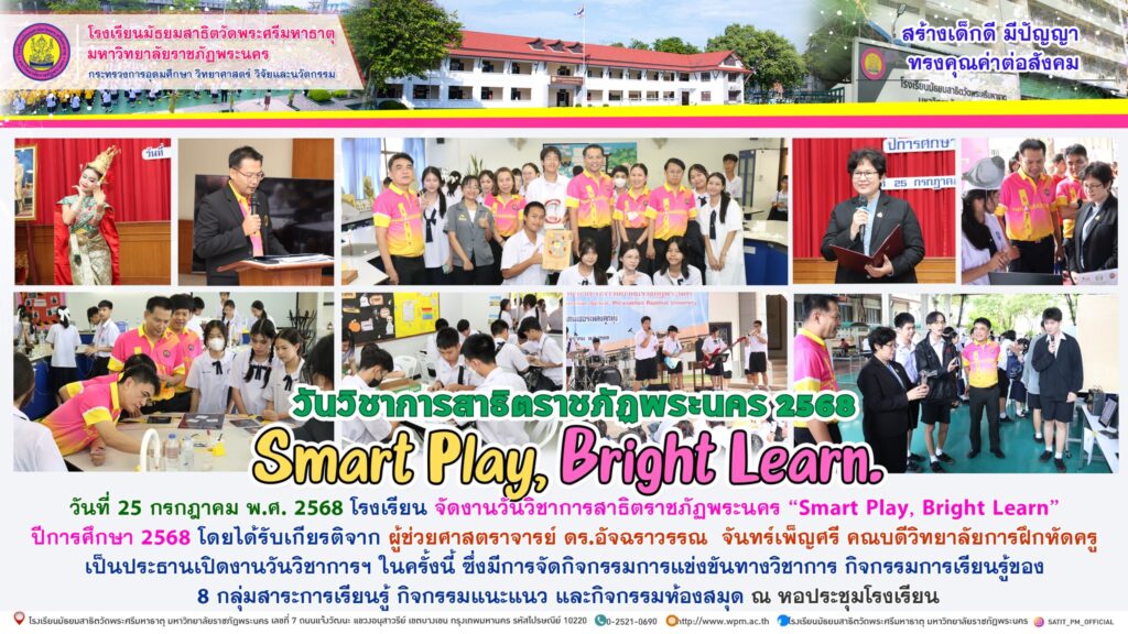 วันที่ 25 กรกฎาคม พ.ศ. 2568 โรงเรียน จัดงานวันวิชาการสาธิตราชภัฏพระนคร “Smart Play, Bright Learn” ปีการศึกษา 2568 โดยได้รับเกียรติจาก ผู้ช่วยศาสตราจารย์ ดร.อัจฉราวรรณ จันทร์เพ็ญศรี คณบดีวิทยาลัยการฝึกหัดครู เป็นประธานเปิดงานวันวิชาการฯ ในครั้งนี้ ซึ่งมีการจัดกิจกรรมการแข่งขันทางวิชาการ กิจกรรมการเรียนรู้ของ 8 กลุ่มสาระการเรียนรู้ กิจกรรมแนะแนว และกิจกรรมห้องสมุด ณ หอประชุมโรงเรียน