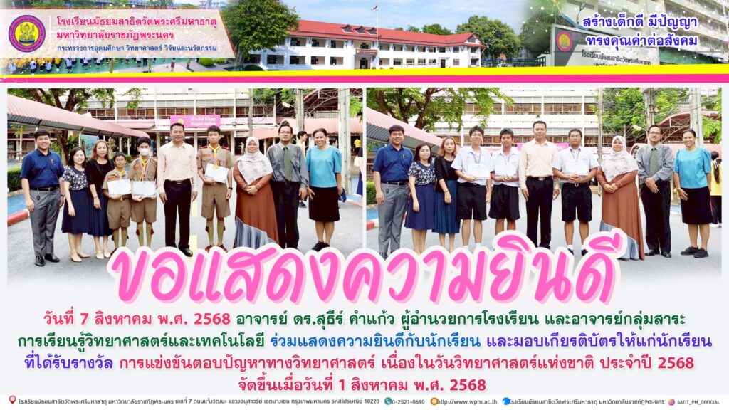 วันที่ 7 สิงหาคม พ.ศ. 2568 อาจารย์ ดร.สุธีร์ คำแก้ว ผู้อำนวยการโรงเรียน และอาจารย์กลุ่มสาระการเรียนรู้วิทยาศาสตร์และเทคโนโลยี ร่วมแสดงความยินดีกับนักเรียน และมอบเกียรติบัตรให้แก่นักเรียนที่ได้รับรางวัล การแข่งขันตอบปัญหาทางวิทยาศาสตร์ เนื่องในวันวิทยาศาสตร์แห่งชาติ ประจำปี 2568 จัดขึ้นเมื่อวันที่ 1 สิงหาคม พ.ศ. 2568