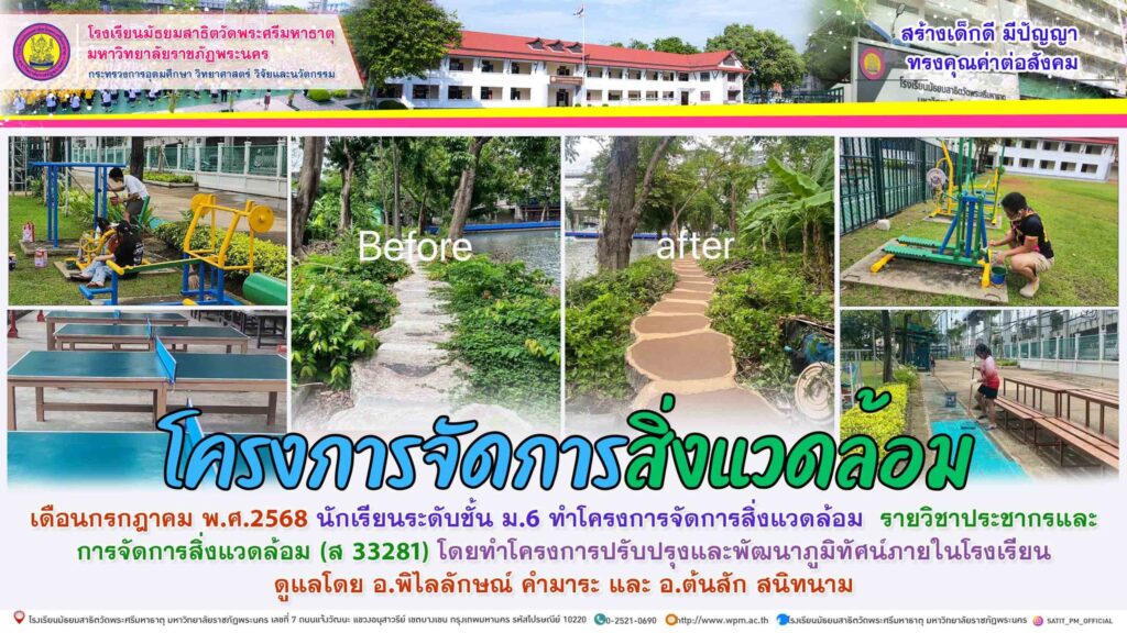 เดือนกรกฎาคม พ.ศ.2568 นักเรียนระดับชั้น ม.6 ทำโครงการจัดการสิ่งแวดล้อม รายวิชาประชากรและ การจัดการสิ่งแวดล้อม (ส 33281) โดยทำโครงการปรับปรุงและพัฒนาภูมิทัศน์ภายในโรงเรียน ดูแลโดย อ.พิไลลักษณ์ คำมาระ และ อ.ต้นสัก สนิทนาม